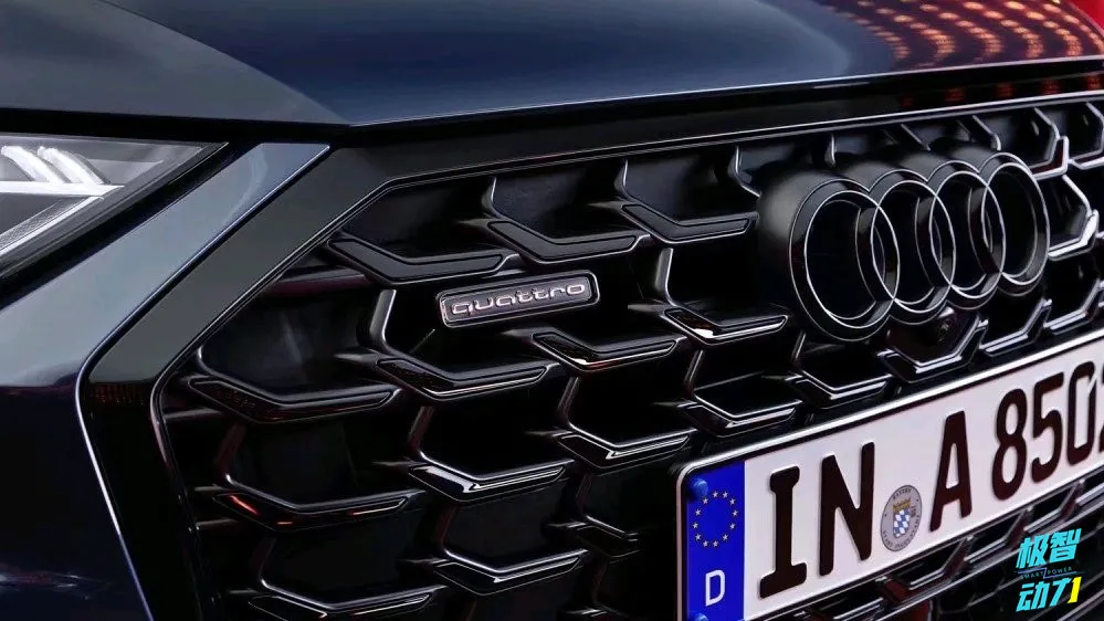 车头正面,中网采用了专属的进气格栅,内部是横竖交错的线条,组合起来,立体感很不错,明显更大气一些。而作为奥迪经典特征的矩阵式LED大灯也还在,进一步增加了车身的辨识度。